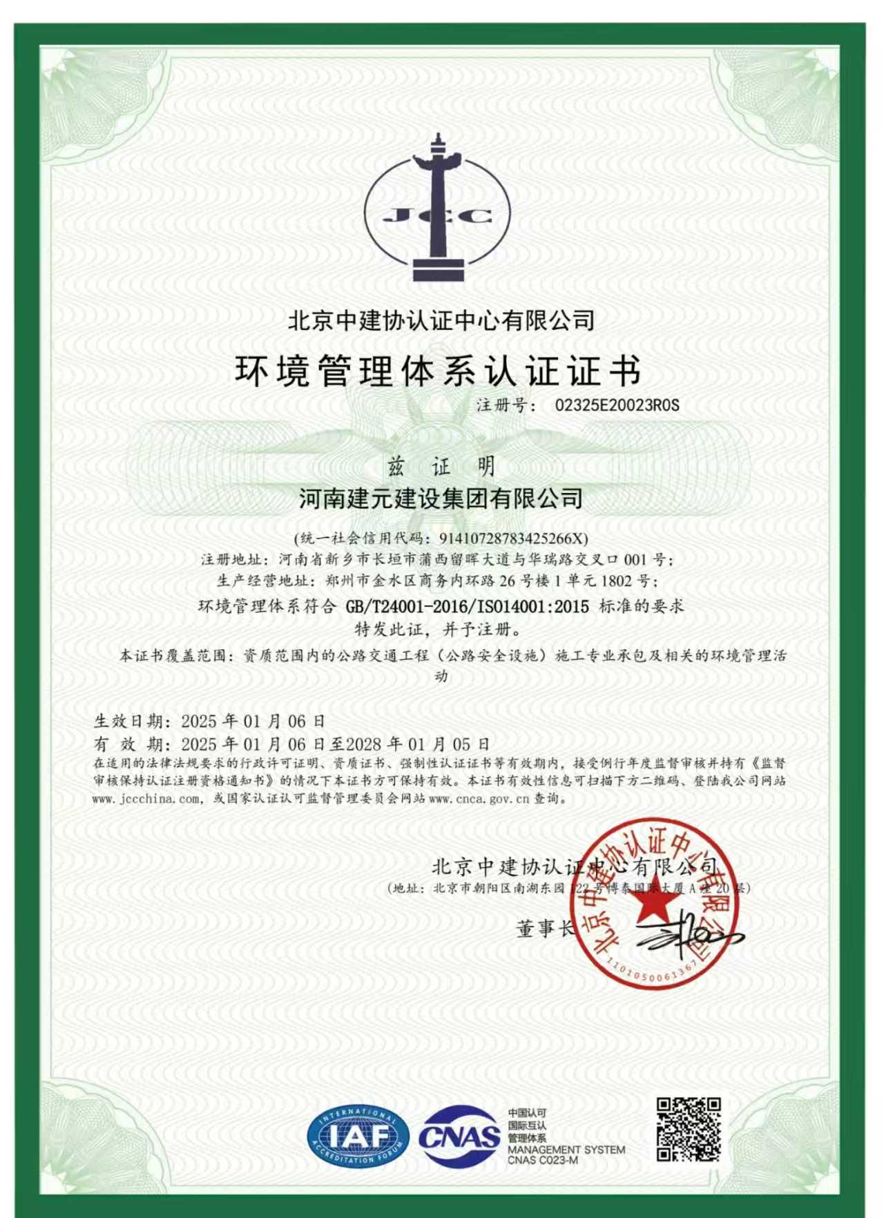 环境管理体系认证证书
