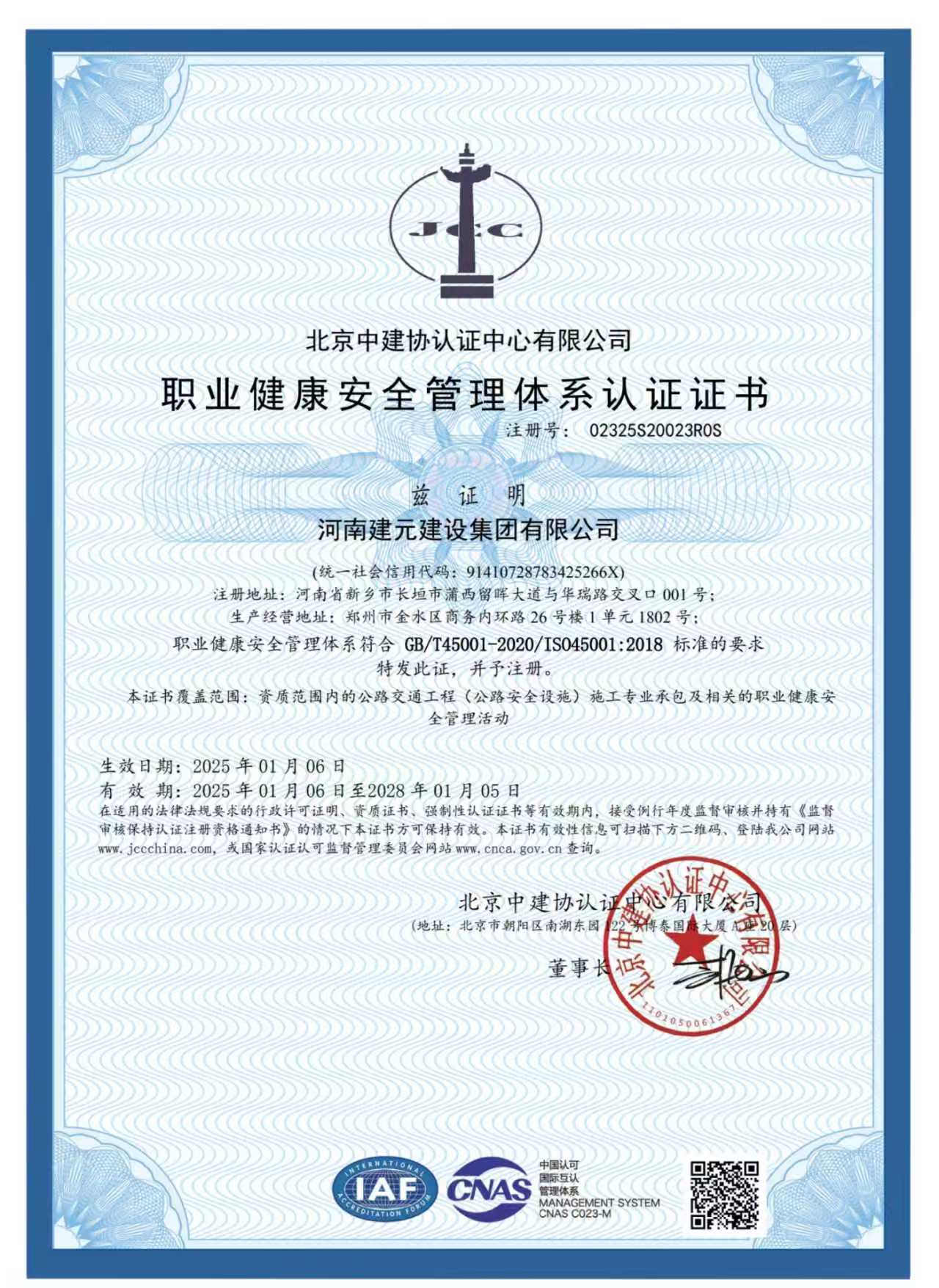 职业健康安全管理体系认证证书